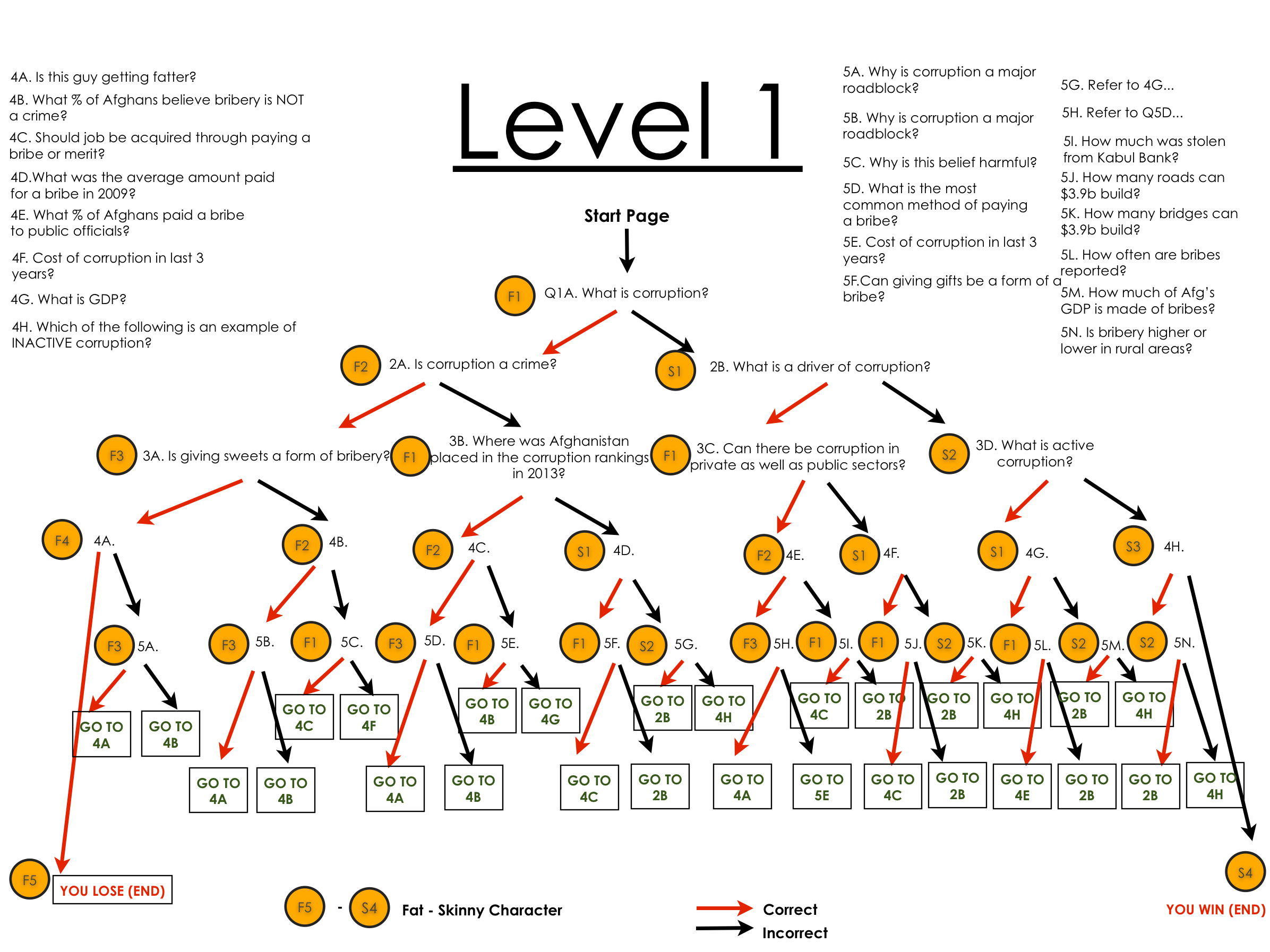 The questions and answers were designed to get harder the better the player did, and easier the more they got wrong. The intention of this level was to ease the player into the game and educate them on the topics at hand. The learnings would be used in subsequent levels.